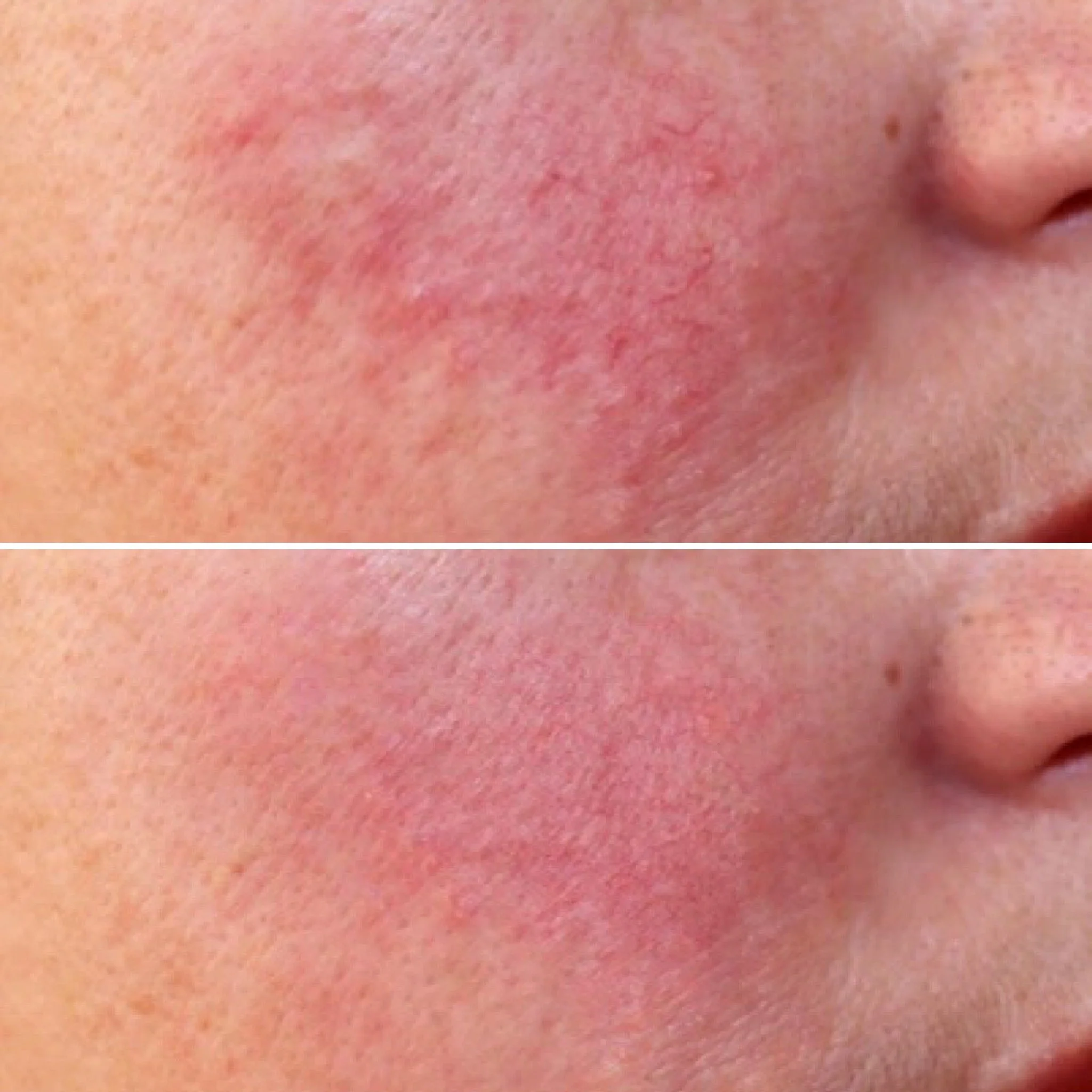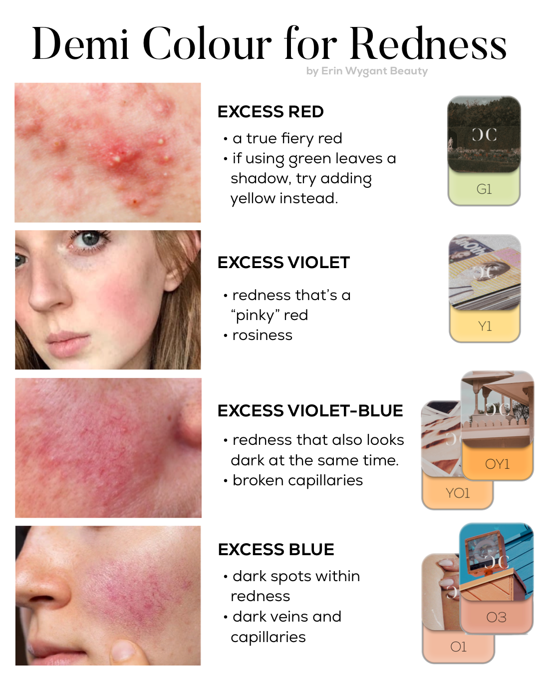 When learning how to use Demi we say the phrase, “If it’s larger than a sesame seed, it’s more than one color”. Your redness in your skin is rarely just one color, especially if it covers a larger area. Most likely, the part that’s the most “distracting” is the darkest points within the overall redness. Oftentimes a single dark spot will make a larger area appear dark, so eliminating that one spot can have a transformative effect. So that’s where you should start.