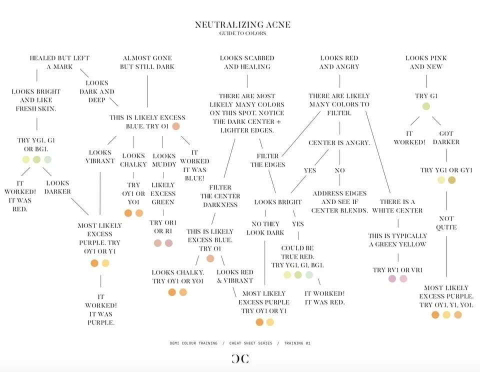 The first step in learning how to use Demi Colour is learning how to identify excess colors in the skin. Our skin is a beautiful mosaic of colors with layers of skin, water, and oil that reflect light and create a natural iridescence that canβt be replicated. Demi Colour aims to filter areas of EXCESS color to bring the complexion back into balance so the natural beauty of the skin can shine through without things like blemishes, dark undereye circles, melasma, etc. distracting the eye.